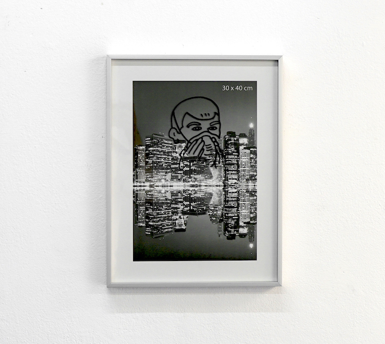 Drawing on glass, aluminium frame