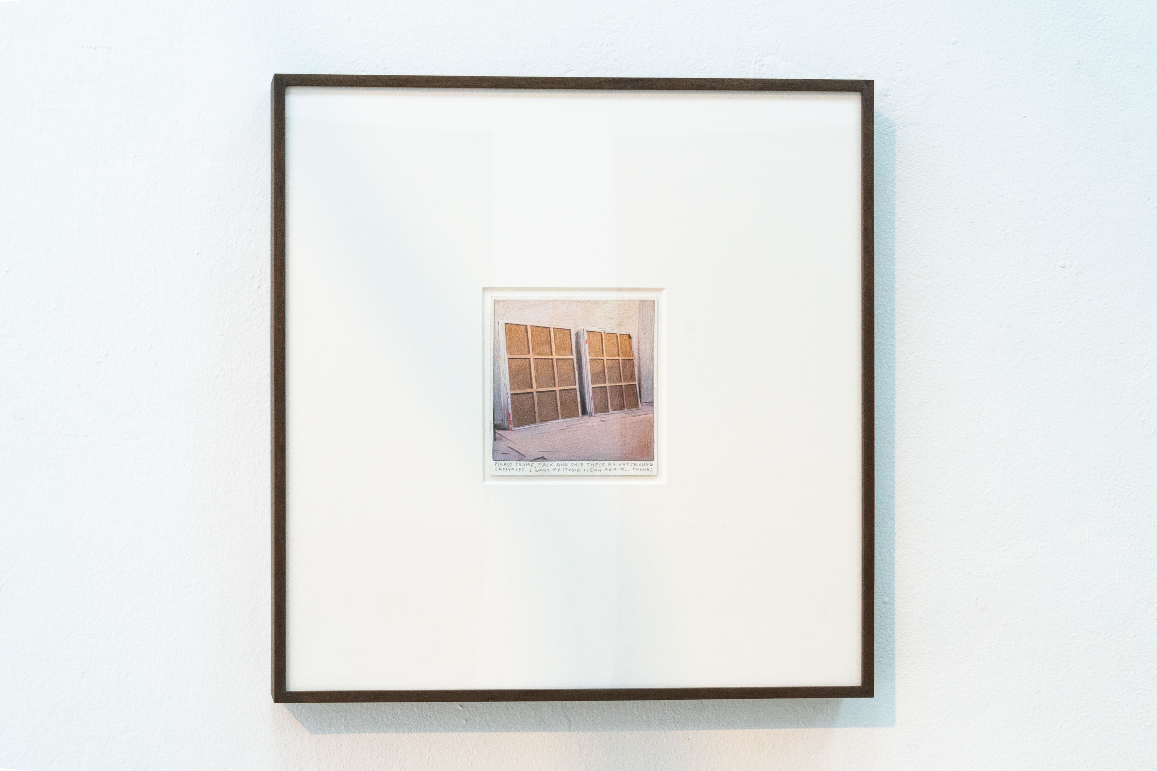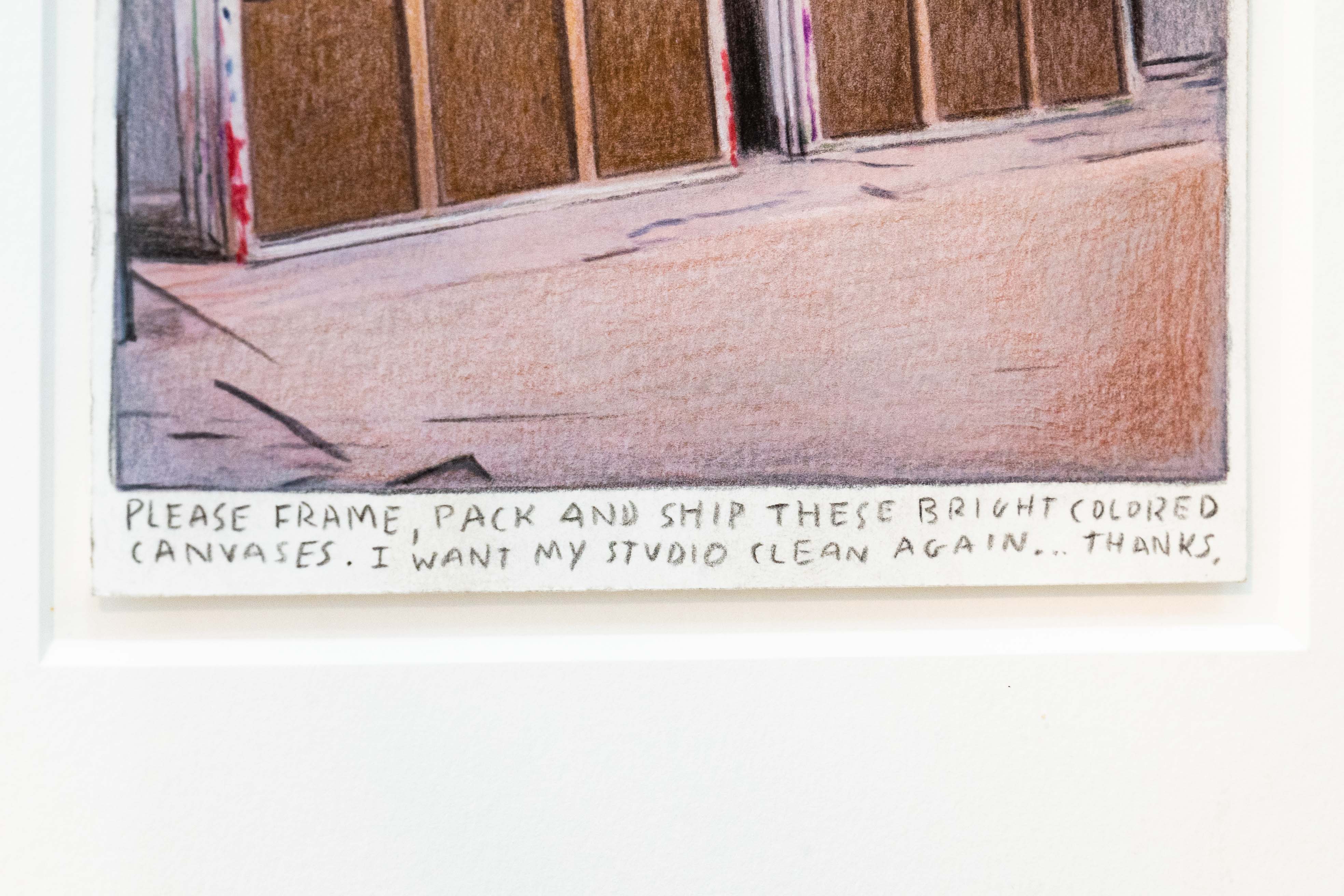 Rinus Van de Velde’s framed drawing comes from a private collection, showing the artist’s studio at work and the expected shipping of the canvases to the exhibition. The work is highly tautological and expresses, among other things, the brutality of labour involved in producing exhibitions. It also illustrates the absence of the artist after the creative part is completed, when logsitics and cultural management takes over: the works leaving the studio.